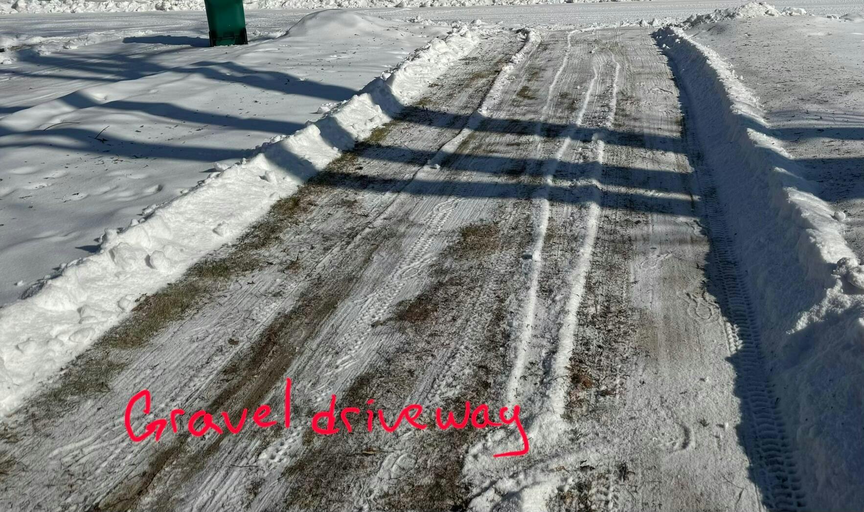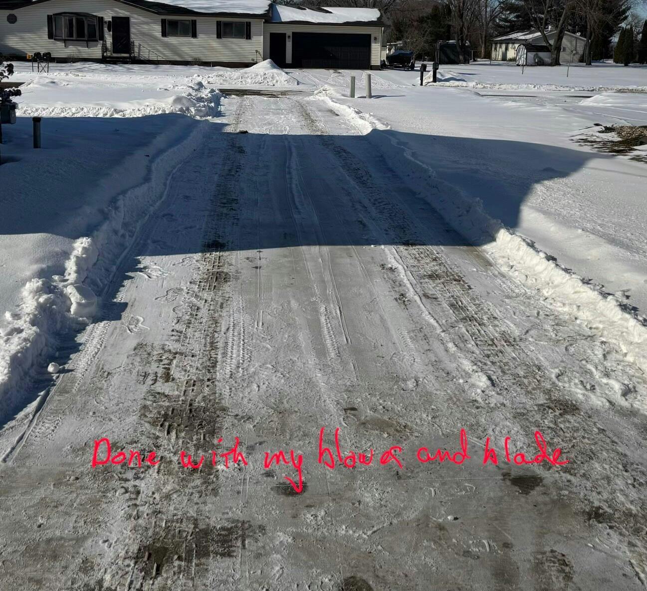 Wet/heavy/slush over 2 inches - there is nothing outside of 96” blade on a full size truck that will address that. Hence picture of neighbour’s drive done by a professional plough, and mine with the throw blade. When that stuff comes in; yes, you will need to clear through the night, or pay a professional. Done and said.